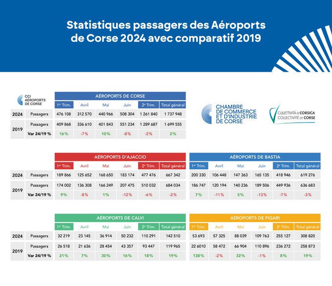 Les aéroports corses ont connu une légère augmentation du nombre de passagers au premier semestre 2024 par rapport à la même période en 2019, selon les récentes statistiques publiées par la Chambre de Commerce et d’Industrie (CCI) de Corse. Un total de 1 737 948 passagers a été enregistré au cours des six premiers mois de l’année, soit une hausse de 2% par rapport à 2019, année de référence avant la pandémie, où 1 699 555 passagers avaient transité par les aéroports de l’île.